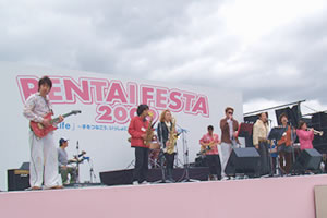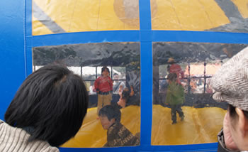 圧力釜のバルブをハンマーで叩いて蓋を開け大きい音とともに勢いよくポン菓子が網かごの中へ。