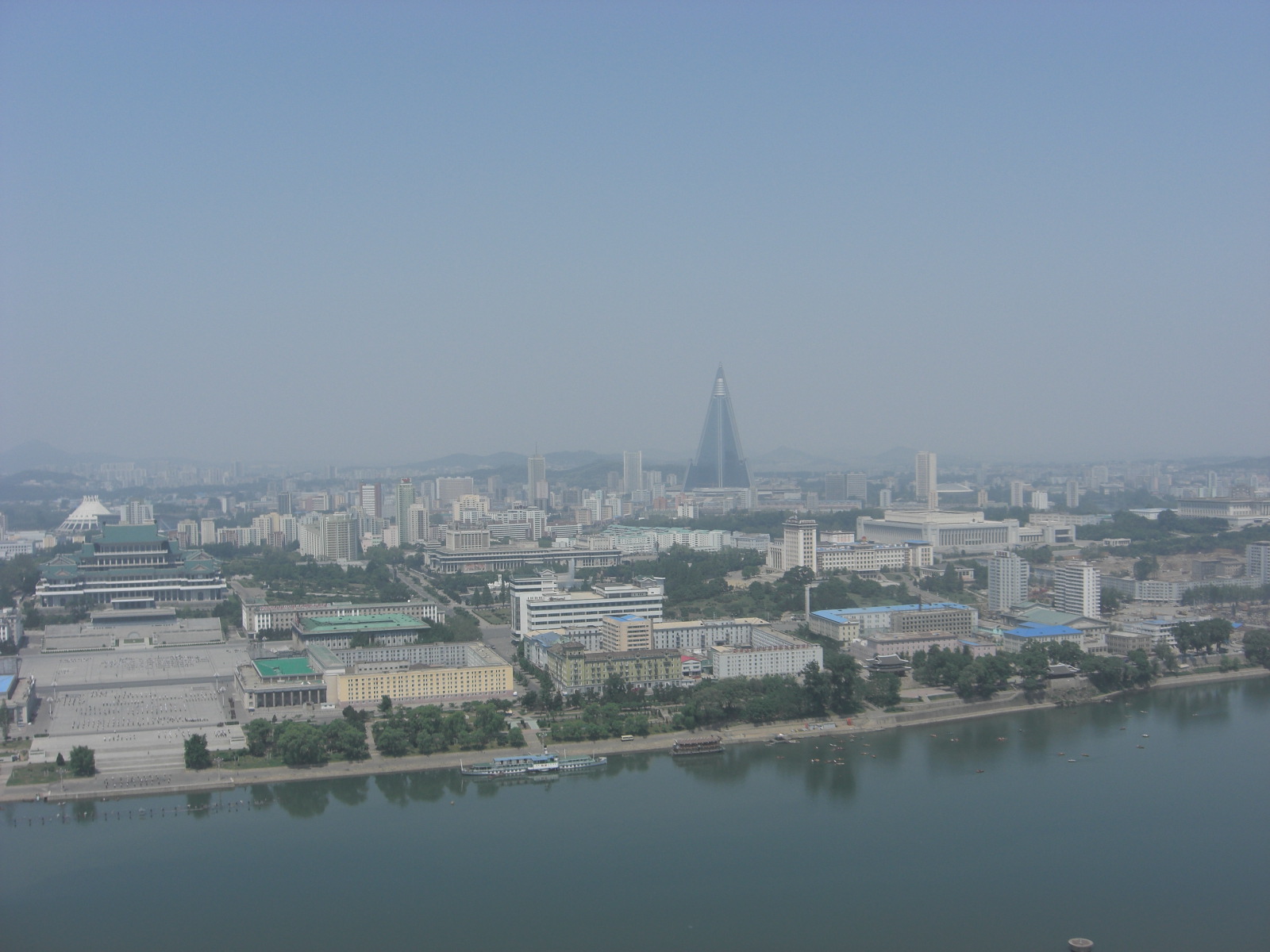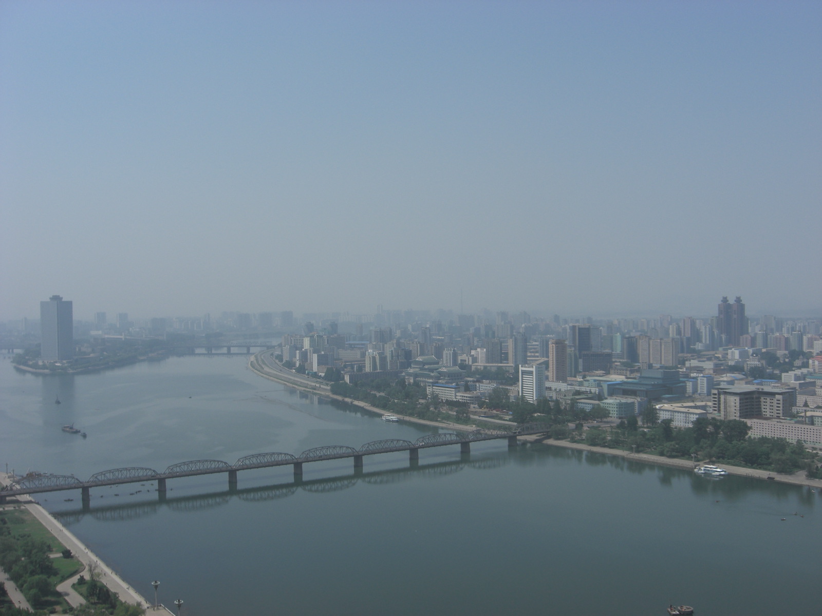 展望台の高台には生家から歩いて10分位で到着。大同江川を挟んだ対岸が遠くまで見渡せる。